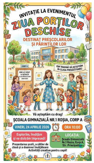 Dragi părinți și viitori școlari,Vă invităm cu drag să participați la ,,ZIUA PORȚILOR DESCHISE,,un eveniment dedicat copiilor care urmează să intre în clasa pregătitoare.