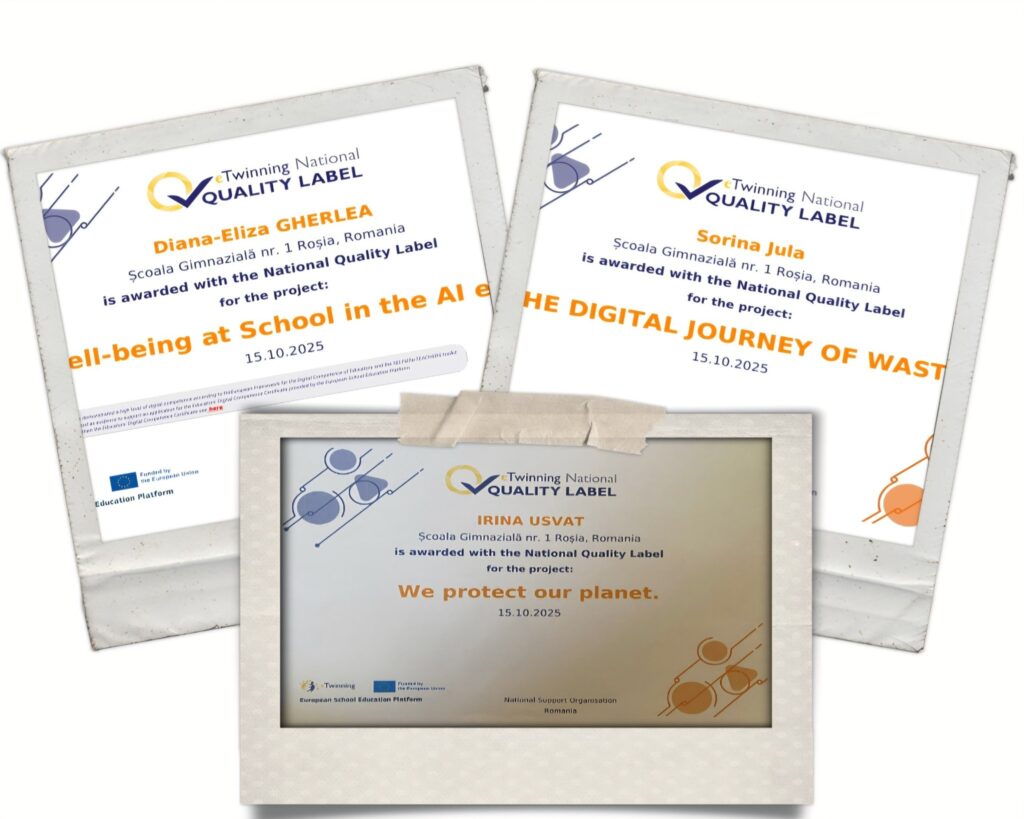 prof. înv. primar Jula Sorina, prof. înv. primar Ușvat Irina și prof. Gherlea Diana – au primit Certificate de Calitate eTwinning pentru proiectele derulate în parteneriat cu școli din Europa, apreciate pentru valoarea lor educațională, creativitate și impact asupra elevilor.